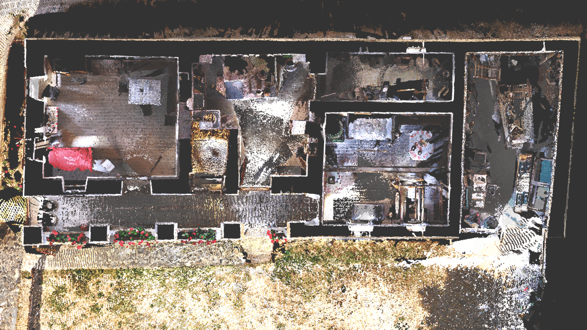 Megbízást kaptunk egy nagyvázsonyi műemléki tájház külső és belső lézerszkenneres felmérésére, majd az ehhez kapcsolódó 3D modell és felmérési tervdokumentáció elkészítésére. Az épület jól körüljárható volt, így a mérések akadálytalanul zajlottak. A tető nagy hajlásszöge kedvező belátási szöget biztosított, ezért nem volt szükség külön drónos felmérésre sem. A felmérést követően másnapra elkészült a teljes pontfelhő, melyet ellenőrzés után, a kért formátumban átadtunk a megrendelőnek. A részletes 3D modell és a felmérési tervek kidolgozása további tíz munkanapot vett igénybe.
